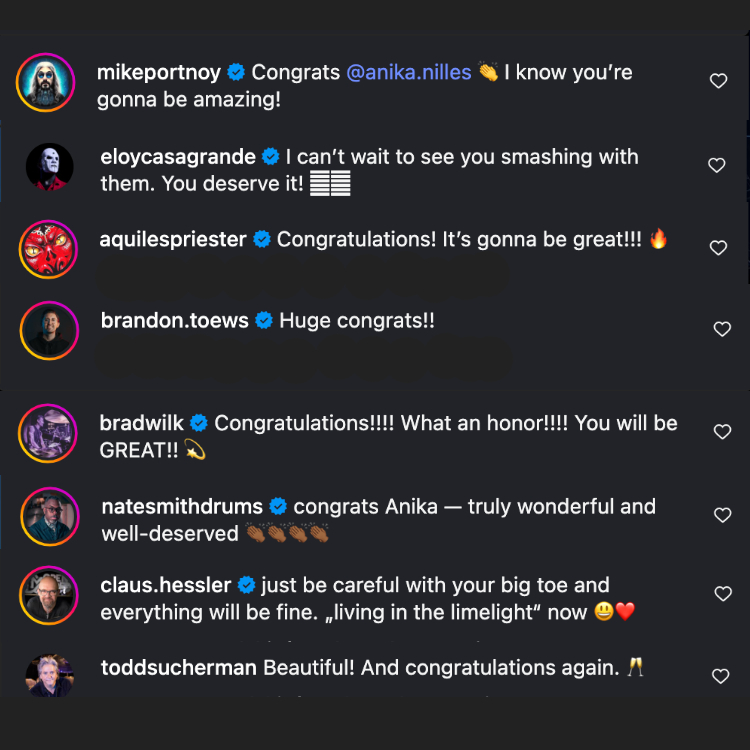 Mike Portnoy (Dream Theater): Congrats @anika.nilles 👏 I know you’re gonna be amazing!