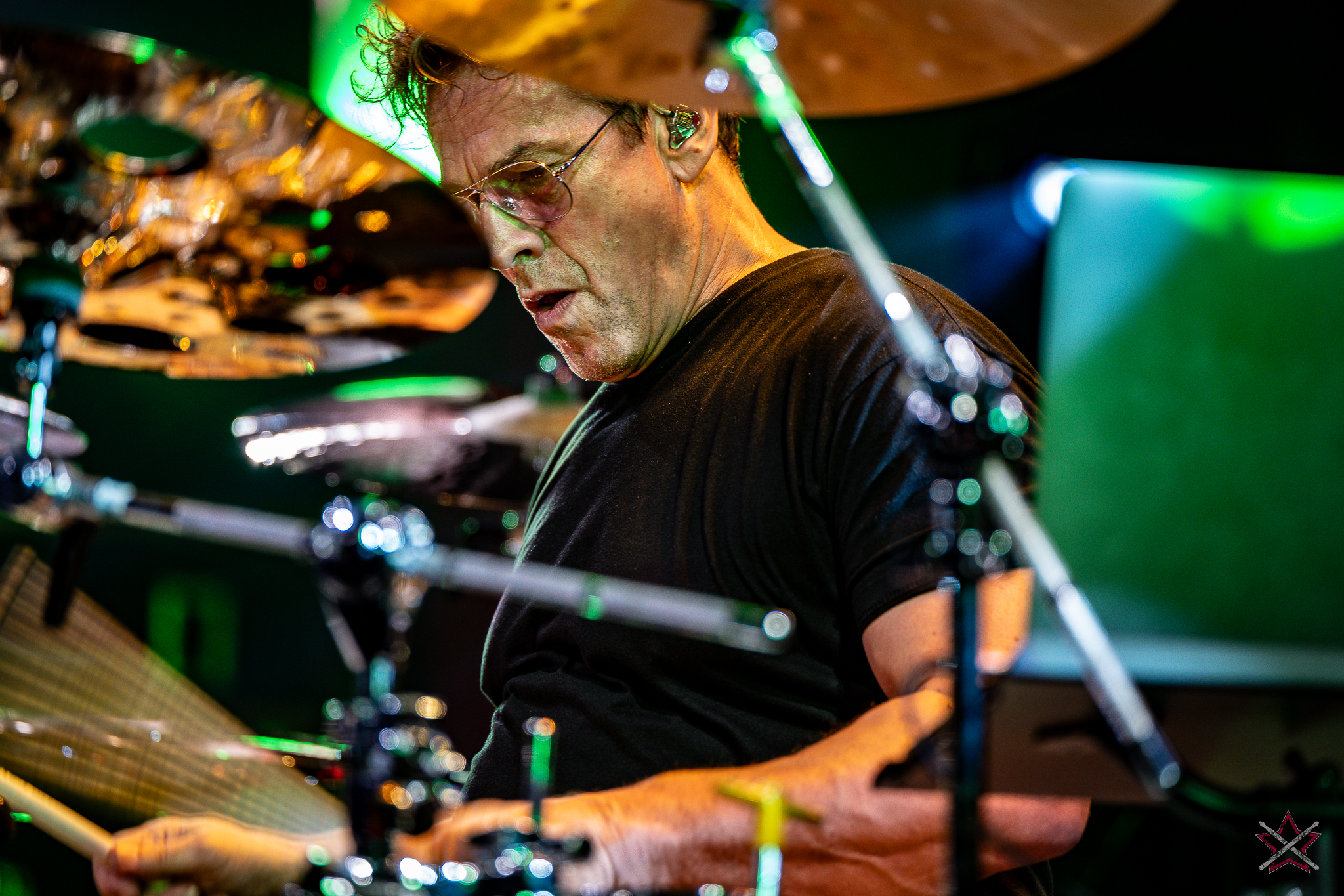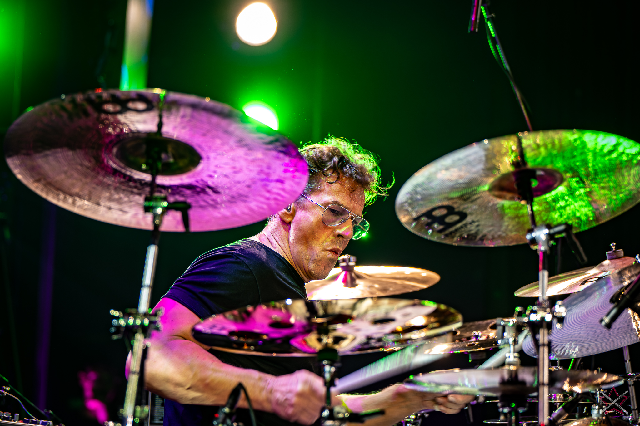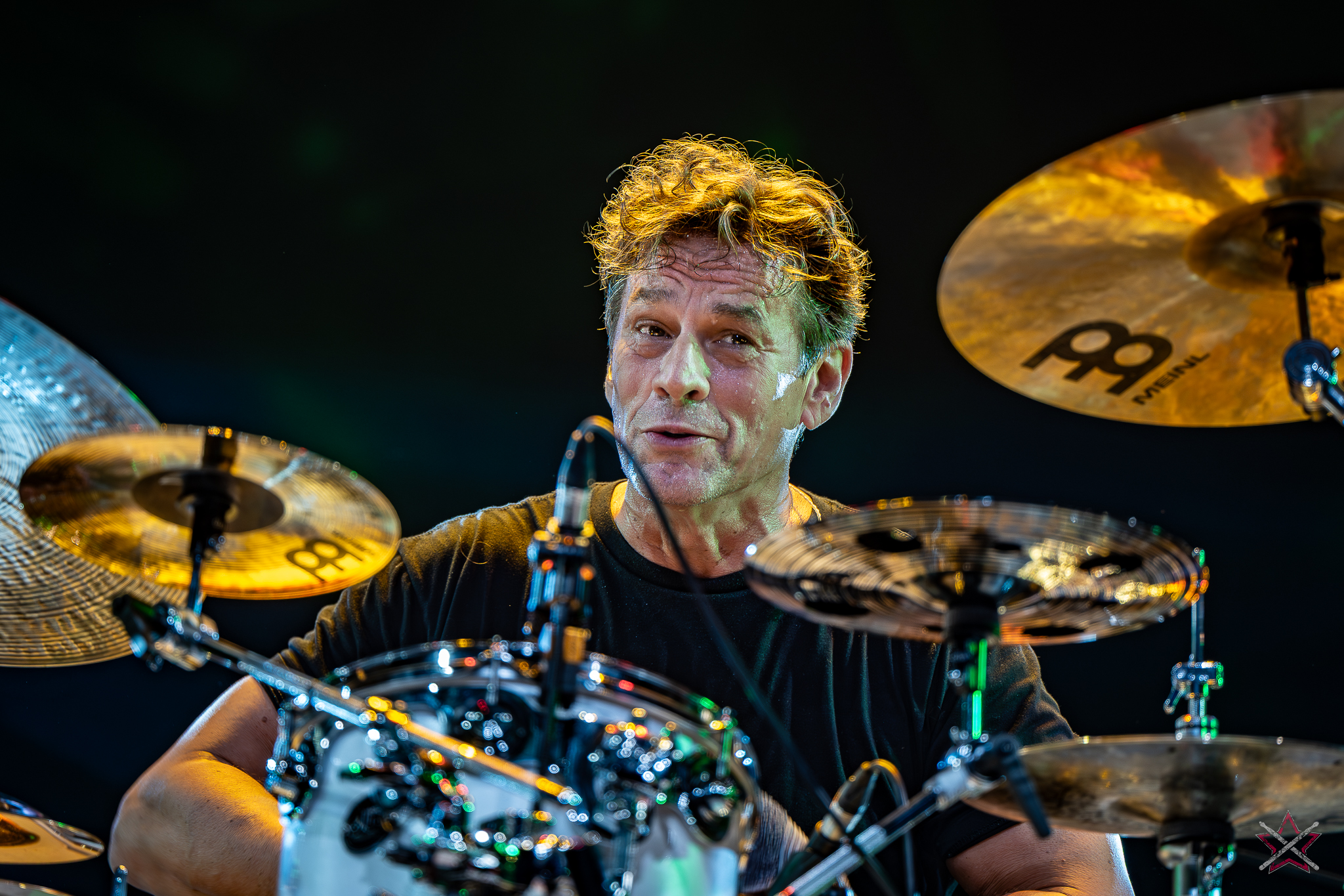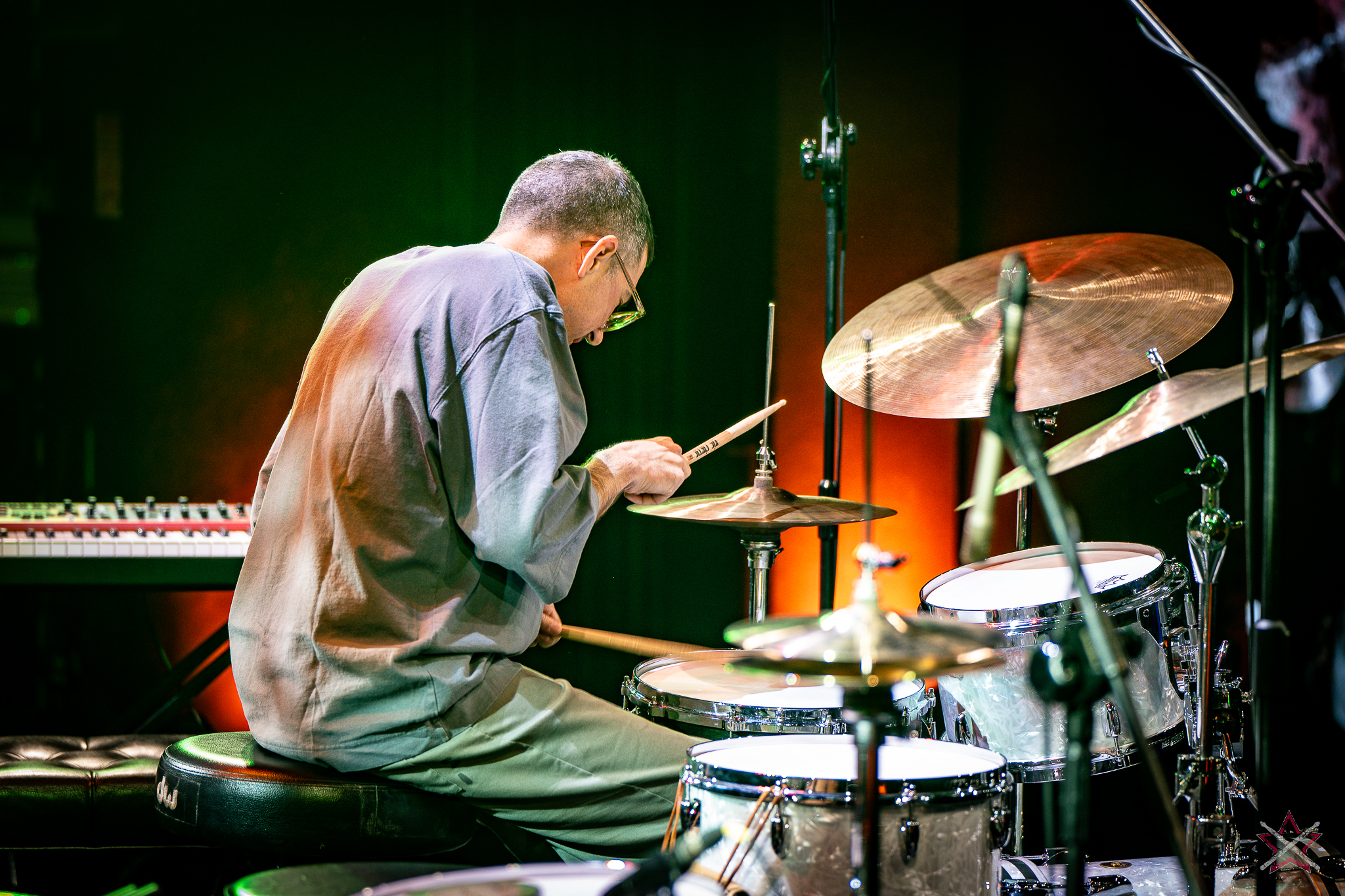decided to go for ethereal sound creation, performing several compositions from his solo album, “Mark,” on which he played all the instruments. Not only did he play rhythmic figures, but also melodic motifs, for which he used drum hoops or a snare drum with disengaged snares. In the second piece, he used a small kit set up on the side of the drum riser: a bass drum, a snare drum, a floor tom, a pair of micro hats and two splashes placed face down on the floor tom and the snare drum. It was enough to leave everyone present in awe. In the next number, he put the emphasis on percussion instruments: the aforementioned splashes on the snare and the drums stool, various kinds of bells on strings, and the rustle of cymbals. Only before the last song did he speak to an almost mesmerized audience, handing out the aforementioned rope bells and chimes (he had dozens of these) to the listeners with a request for creating accompaniment. He showed that it is possible to capture an audience’s attention and enchant with musicianship without being flashy. The long queue of people eager to get an autograph or have their picture taken together after this performance (Mark was in a hurry to catch a plane and couldn’t wait until the evening signing session) proves that we were not alone in this opinion.