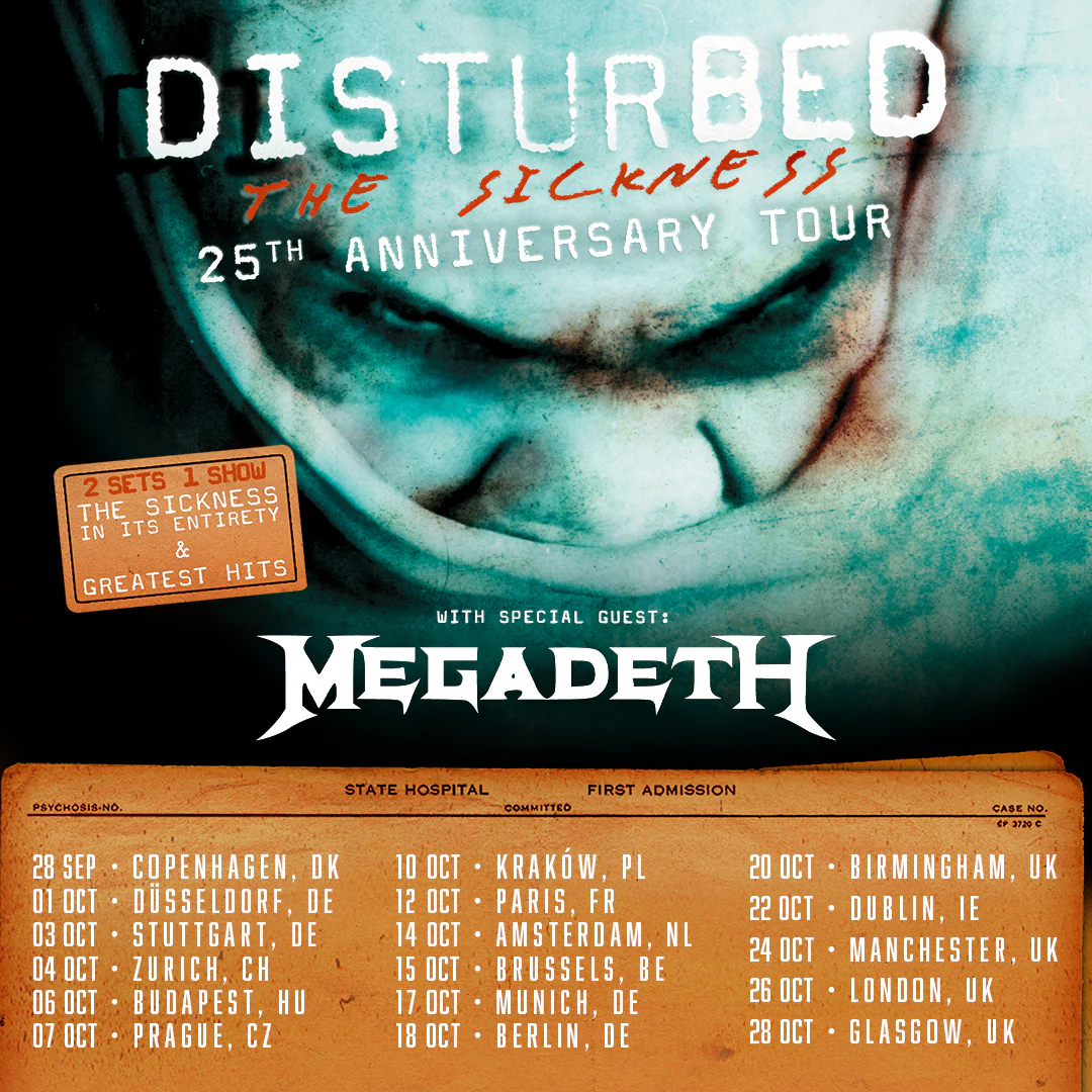 It has been 25 years since the release of Disturbed‘s breakthrough debut album, “The Sickness” (released March 7, 2000). Celebrating the 25th anniversary, David Draiman (vocals), Dan Donegan (guitar), John Moyer (bass guitar) and Mike Wengren (drums) have embarked on a tour of North America and will be hitting Europe later this year.