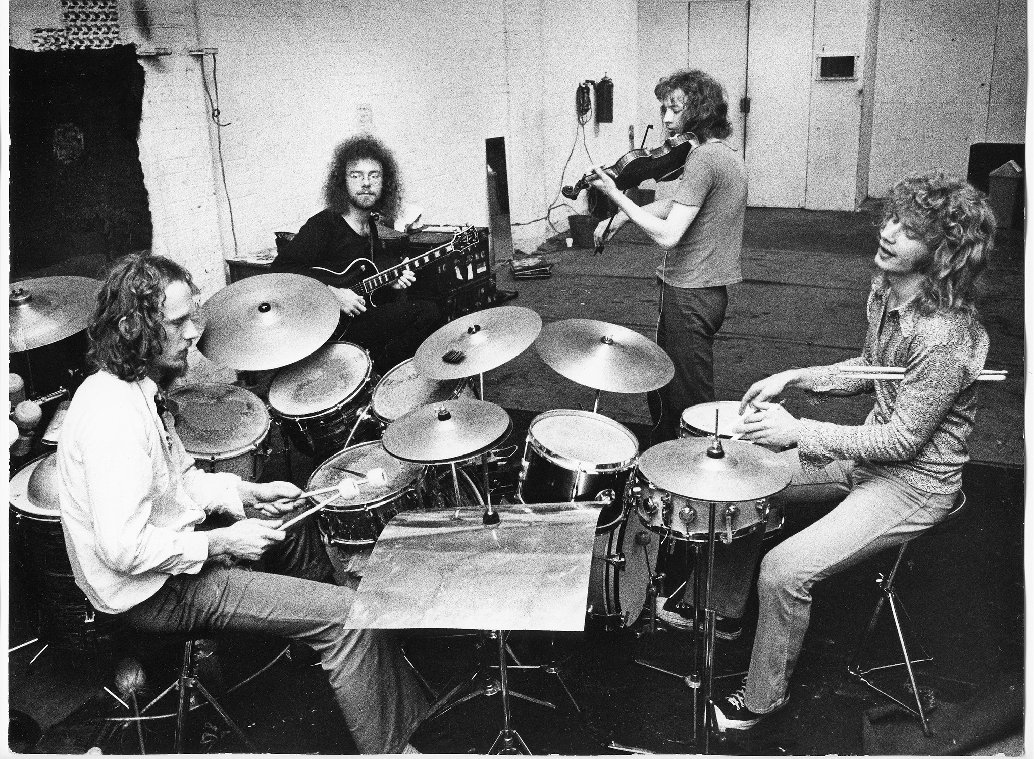 King Crimson in Covent Garden, London 1972. L-R Jamie Muir, Robert Fripp, David Cross, Bill Bruford. Image by Barrie Wentzell.