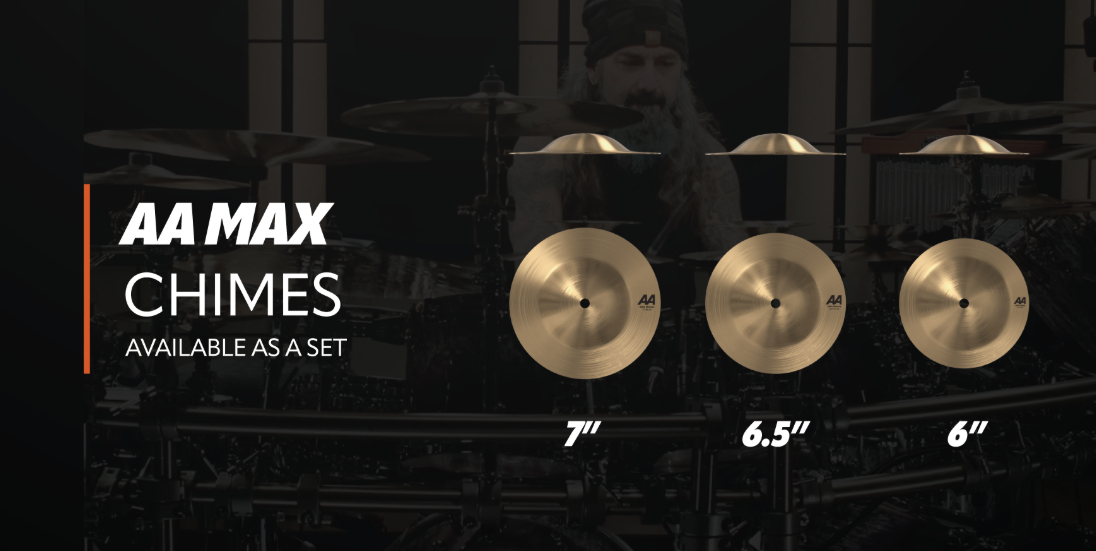 The new 6, 6.5, 7″ AA MAX Chimes. Are thinner than a cup chime or ice bell, but much thicker than a splash. These small chimes sound great on their own or mount them upside down on top of other cymbals like Mike does. Crisp, clear and well defined. Available individually and as a set of three.