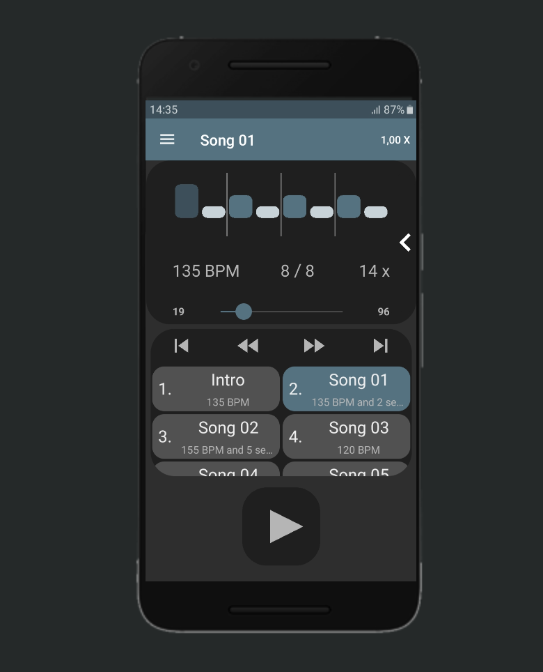 ⭐⭐⭐⭐⭐ – Very clear, modern interface. Playlists, accents and tempos created and adjusted with a simple tap.